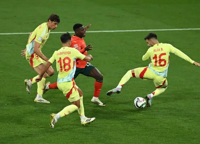Ngay từ đầu trận, Tây Ban Nha kiểm soát bóng vượt trội với phong cách chuyền ngắn đặc trưng. Phút 21, cầu thủ trẻ Lamine Yamal thực hiện đường tạt khó chịu từ cánh phải, bóng lập bập trong vòng cấm khiến hàng thủ Bồ Đào Nha không thể phá ra dứt điểm. Martin Zubimendi tận dụng cơ hội sút tung lưới mở tỷ số 1-0.
